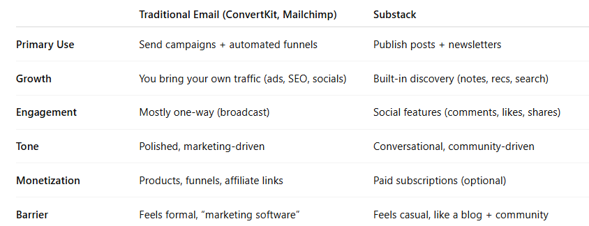 Email service providers (like Kit, ActiveCampaign, Flodesk) are built for funnels and sales, not public storytelling with a built-in discovery platform.